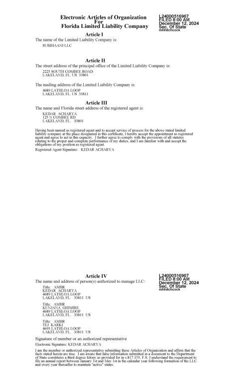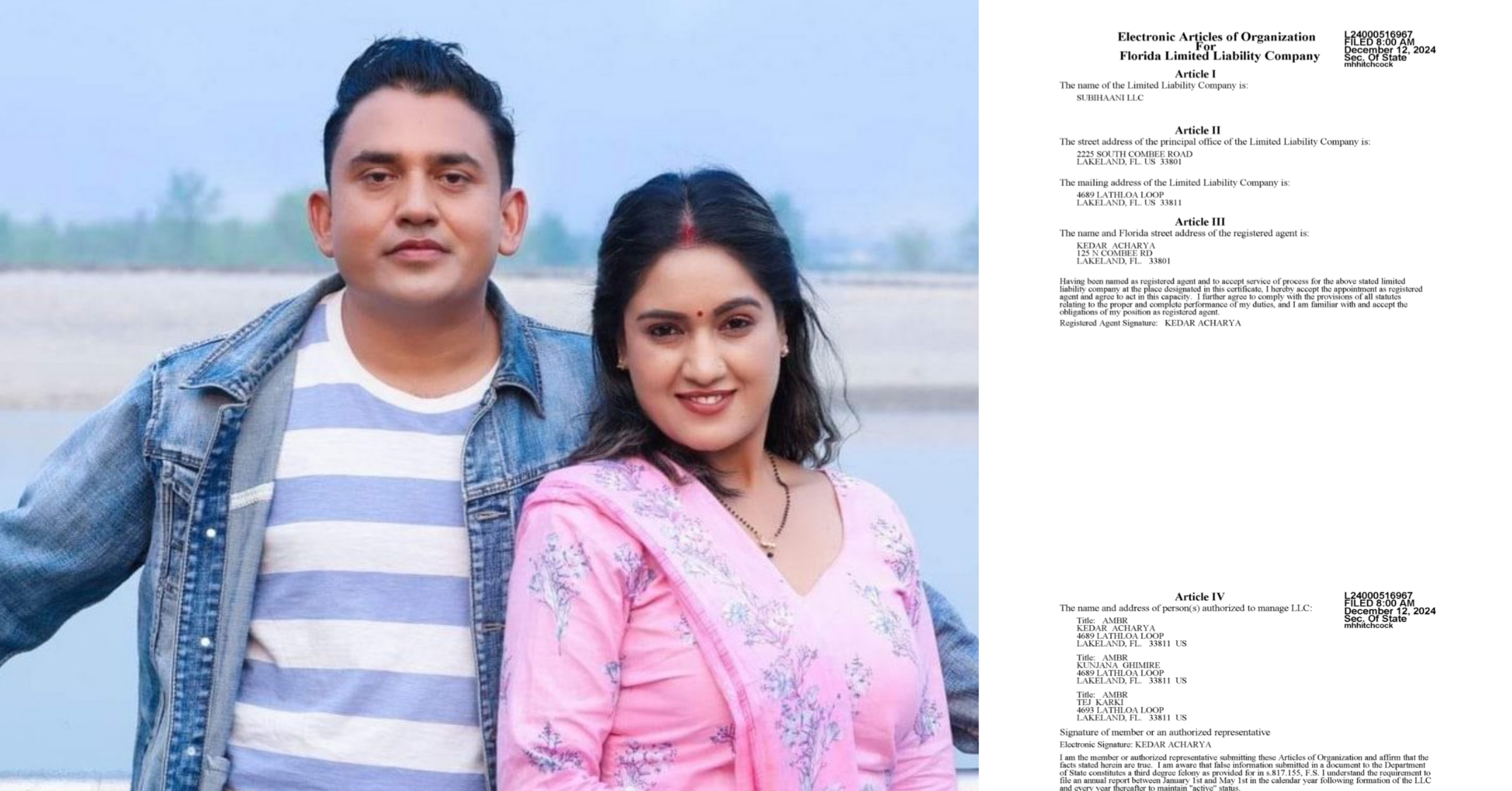 फ्लोरिडा राज्यको कम्पनी हेर्ने सरकारी कार्यालयको वेबसाइटमा केदार आचार्य, कुञ्जना घिमिरे र तेज कार्कीको नाममा सुभिना एलएलसी नामको कम्पनी खोलेको कागजात देखिएको छ । तर, प्राप्त कागजातमा कम्पनी के कस्तो भन्ने विषयमा भने खुलाइएको छैन ।