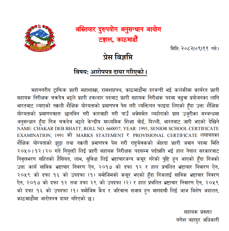 अख्तियार दुरुपयोग अनुसन्धान आयोगले महानगरीय ट्राफिक प्रहरी महाशाखा, रामशाहपथ, काठमाडौँमा कार्यरत तत्कालीन प्रहरी सहायक निरीक्षक चक्रदेव भट्टविरुद्ध शैक्षिक योग्यताको नक्कली प्रमाणपत्र सम्बन्धी आरोपमा मुद्दा दायर गरेको हो ।
