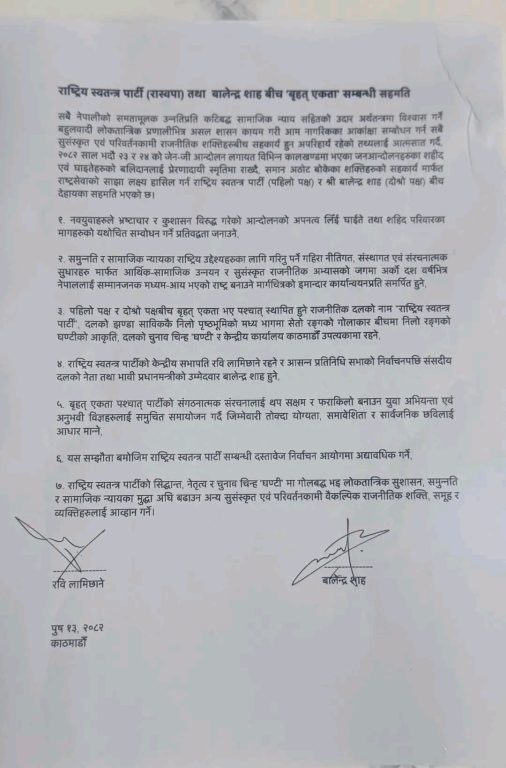 काठमाडौँ । राष्ट्रिय स्वतन्त्र पार्टी (रास्वपा) र काठमाडौँ महानगरपालिकाका प्रमुख बालेन्द्र शाहबीच ‘बृहत् एकता’ सम्बन्धी सहमति भएको छ ।