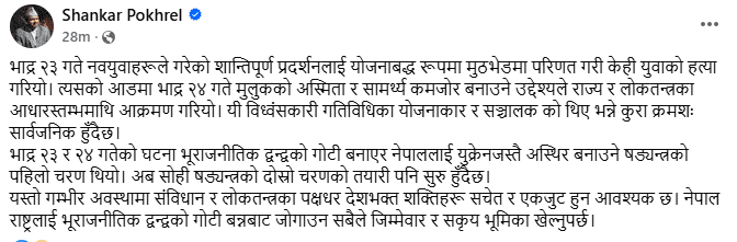उनका अनुसार भदौ २३ गते नवयुवाहरूले गरेको शान्तिपूर्ण प्रदर्शनलाई योजनाबद्ध रूपमा हिंसात्मक बनाइँदा केही युवाको ज्यान गएको थियो। त्यसैको आडमा भदौ २४ गते राज्य, लोकतन्त्र तथा राष्ट्रिय अस्मिताका आधार स्तम्भमाथि आक्रमण भएको आरोप पनि उनले लगाएका छन्।