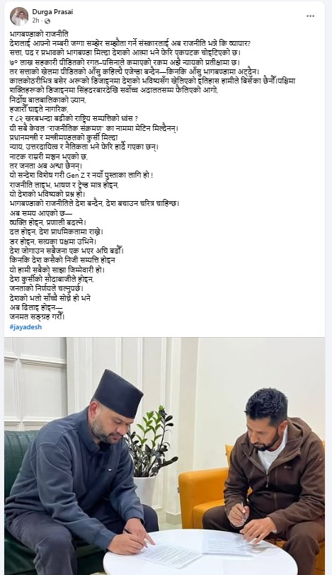 काठमाडौं । ‘राष्ट्र, राष्ट्रियता, धर्म, संस्कृति र नागरिक बचाउन महाअभियान नेपाल’का संयोजक दुर्गा प्रसाईंले राष्ट्रिय स्वतन्त्र पार्टीका सभापति रवि लामिछाने र काठमाडौं महानगरपालिकाका मेयर बालेन्द्र शाह (बालेन)बीच भएको सहमतिप्रति कडा आलोचना गरेका छन्।
