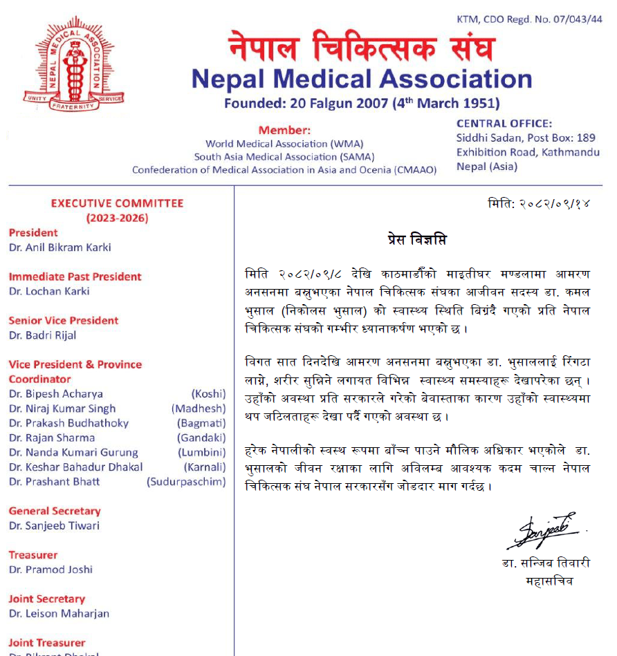 काठमाडौं । माइतीघर मण्डलामा सात दिनदेखि आमरण अनसनमा रहेका डा. निकोलस भुसालको स्वास्थ्य अवस्था चिन्ताजनक बन्दै गएको छ। नेपाल चिकित्सक संघका आजीवन सदस्यसमेत रहेका भुसालको अवस्थाप्रति संघले गम्भीर ध्यानाकर्षण जनाएको छ।