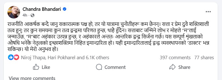 शुक्रबार सामाजिक सञ्जाल फेसबुकमार्फत आफ्ना विचार सार्वजनिक गर्दै उनले सत्ता र प्रेम दुवै अत्यन्त शक्तिशाली तत्व भए पनि कुन बेला कुन तत्व द्वन्द्वमा परिणत हुन्छ भन्ने कुरा अनिश्चित रहने उल्लेख गरेका छन्।