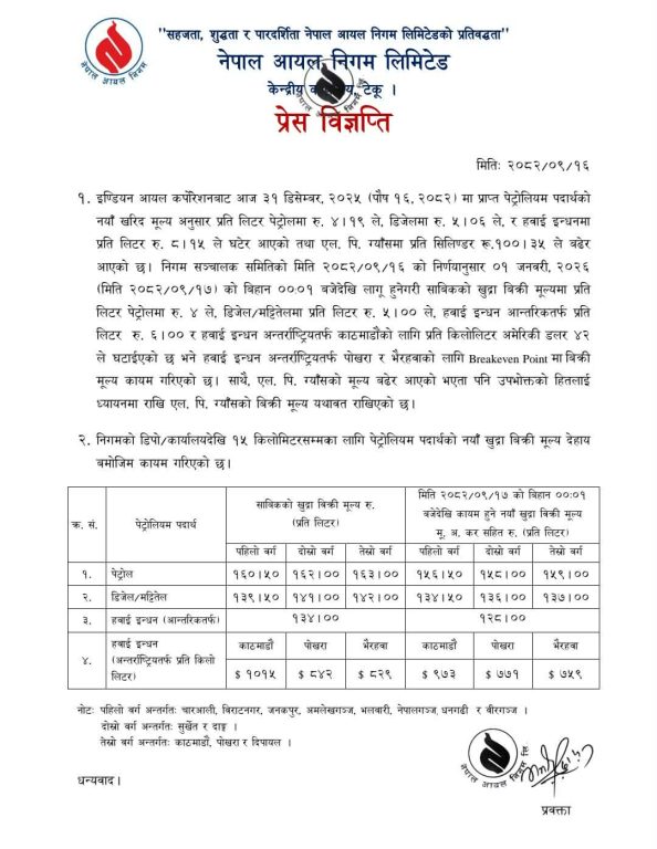 त्यस्तै हवाई इन्धन आन्तरिकतर्फ प्रतिलिटर रु. ६ र हवाई इन्धन अन्तर्राष्ट्रियतर्फ काठमाडौँको लागि प्रति किलोलिटर अमेरिकी डलर ४२ ले घटाइएको छ  ।