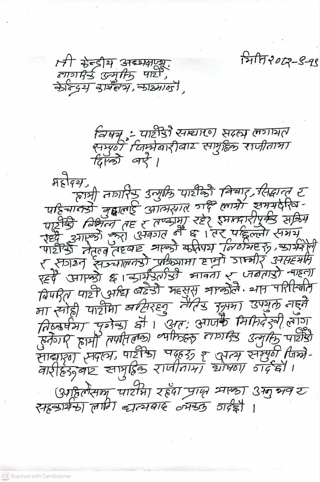 अध्यक्ष थारुले पार्टी नेतृत्वले कार्यकर्ताको भावना र जनचाहनाविपरीत काम गरेकाले नैतिक रूपमा पार्टीमा बसिरहन उपयुक्त नदेखिएको बताए। राजीनामा दिनेमा वरिष्ठ उपाध्यक्ष राकेश कोइरी, केन्द्रीय सदस्यहरू महेश गिरी, तारादेवी चौधरी, मञ्जु दगुरिया, केशव चौधरी तथा प्रदेश सदस्य माधव चौधरीलगायत रहेका छन्।