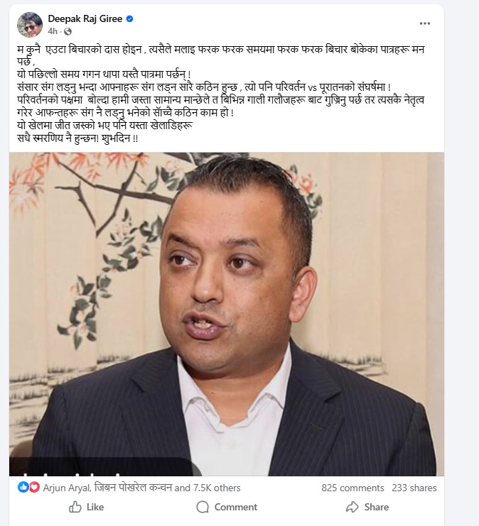 सामाजिक सञ्जाल फेसबुकमा एक पोस्ट लेख्दै गिरीले आफू कुनै एउटा विचारको दास नभएको प्रष्ट पार्दै पछिल्लो समय गगन थापाको कार्यशैली र सङ्घर्षले आफूलाई प्रभावित पारेको उल्लेख गरेका हुन् ।