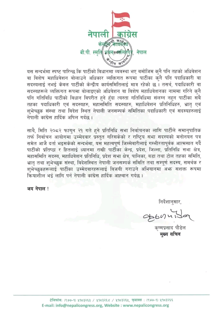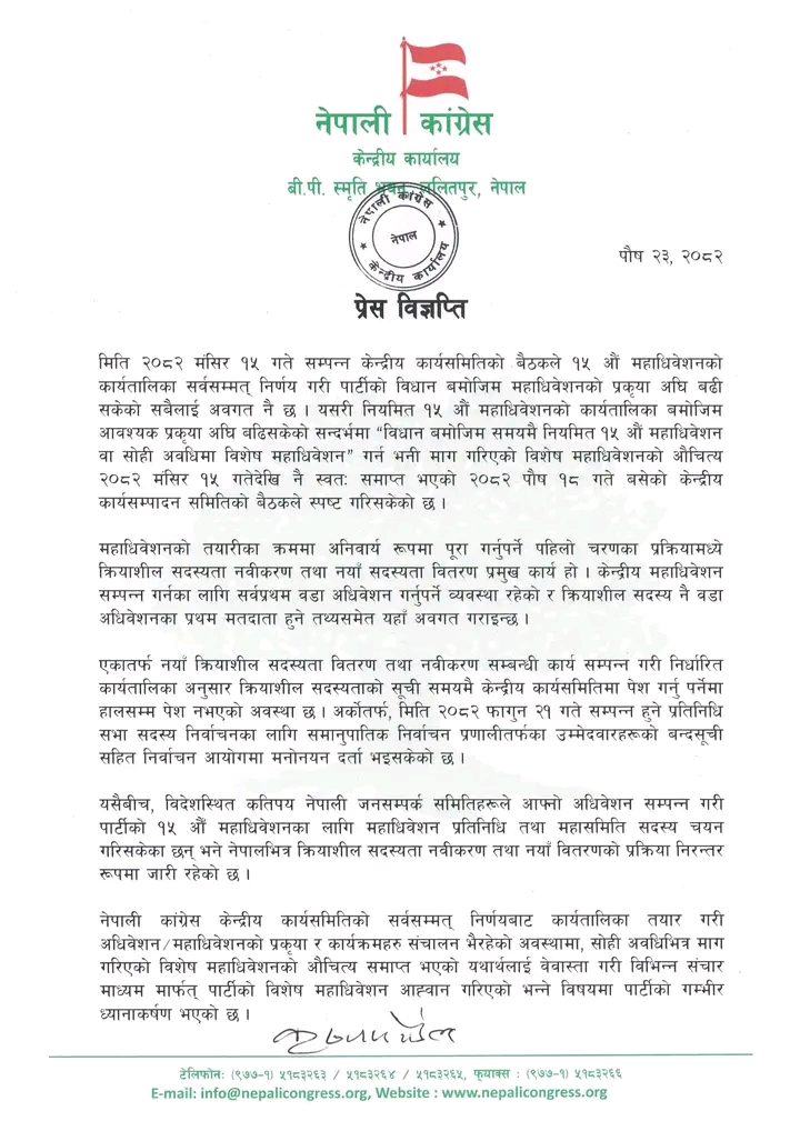 काठमाडौं । नेपाली कांग्रेसका महामन्त्री द्वय गगन थापा र विश्वप्रकाश शर्माले विशेष महाधिवेशनमा सहभागी हुन आह्वान गरेका छन्। बुधबार दुवै महामन्त्रीले संयुक्त वक्तव्य जारी गर्दै विशेष महाधिवेशनमा सहभागी हुन आह्वान गरेका हुन्।