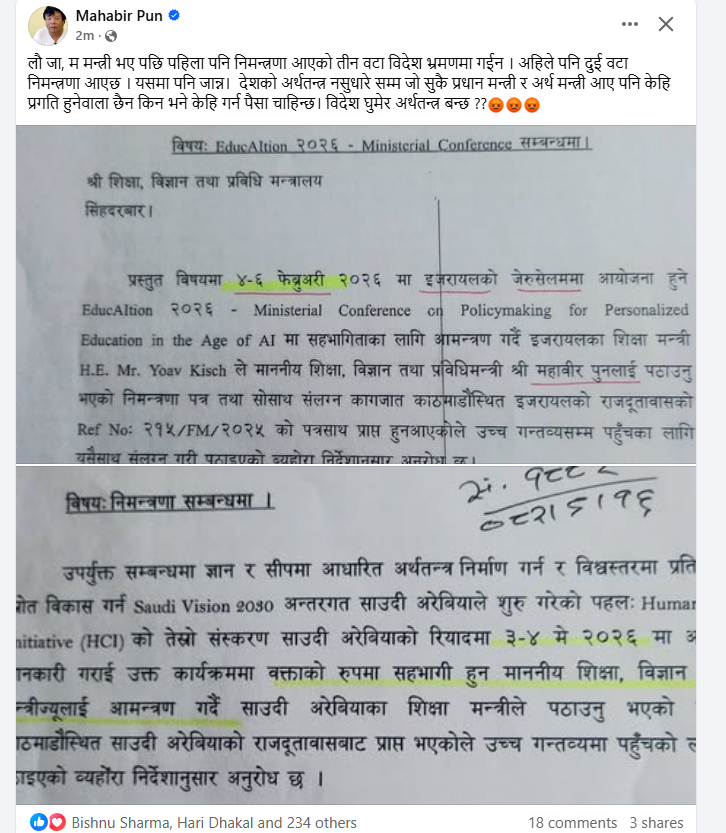 इजरायल र साउदी अरबमा आयोजना हुने कार्यक्रमका निमन्त्रणापत्र सामाजिक सञ्जाल फेसबुकमार्फत सार्वजनिक गर्दै मन्त्री पुनले देशको अर्थतन्त्र सुदृढ नहुँदासम्म सरकार परिवर्तन वा नेतृत्व फेरिए पनि उल्लेखनीय प्रगति सम्भव नहुने टिप्पणी गरेका छन्।