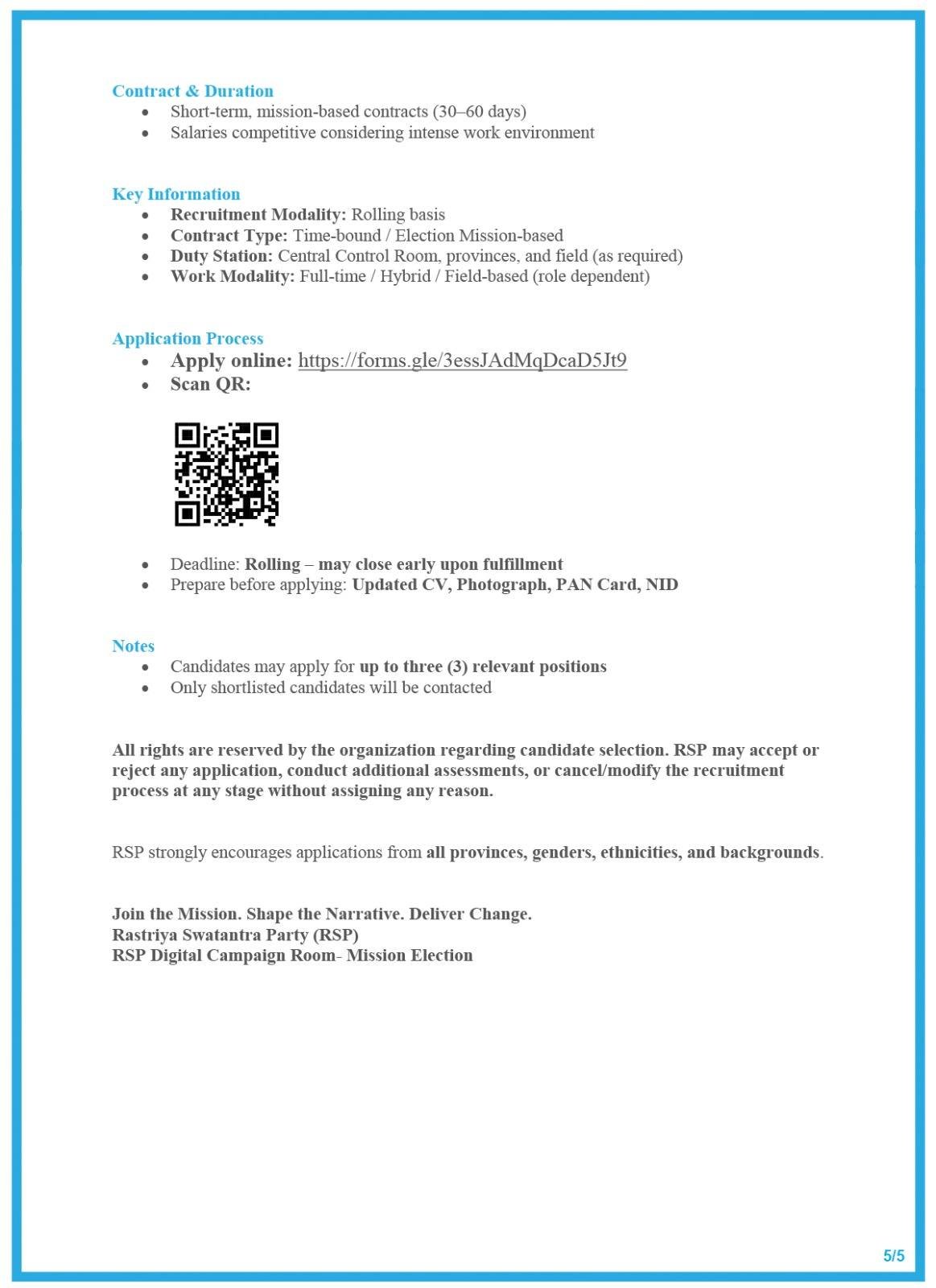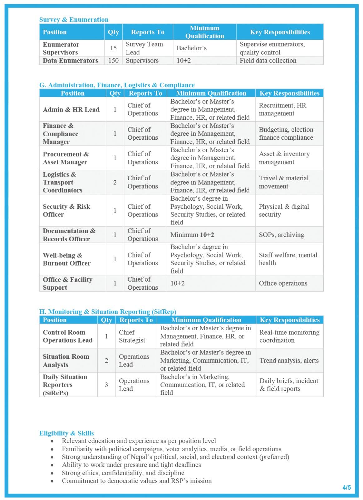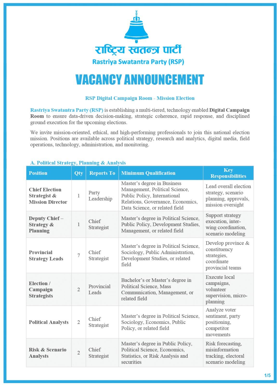 रास्वपाका अनुसार राजनीतिक रणनीति, अनुसन्धान तथा विश्लेषण, डिजिटल मिडिया, फिल्ड अपरेसन, प्रविधि, प्रशासन र अनुगमन क्षेत्रका विभिन्न पदहरूमा आवेदन खुला गरिएको छ। आवेदन प्रक्रिया अनलाइनमार्फत हुने जनाइएको छ।