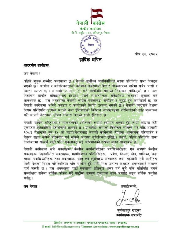 खड्काको यस अपिलले कांग्रेसभित्रको एकता कायम राख्ने र विवाद न्यून गर्ने प्रयासको संकेत भएको बुझिएको छ।
