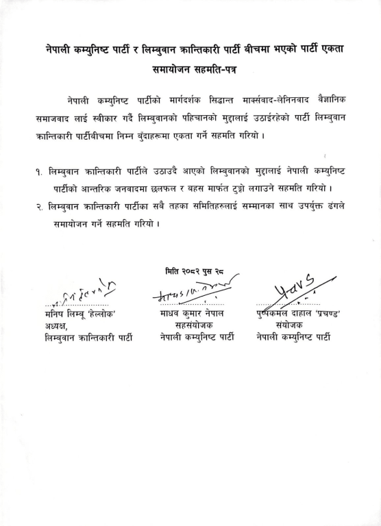 सहमति अनुसार, लिम्बुवान क्रान्तिकारी पार्टीको उठाएको लिम्बुवान मुद्दा नेपाली कम्युनिस्ट पार्टीको आन्तरिक जनवादको बहस र छलफल मार्फत समाधान गर्ने सहमति भएको छ। साथै, पार्टीका सबै तहका समितिहरू सम्मानका साथ समायोजन गरिने व्यवस्था गरिएको छ।