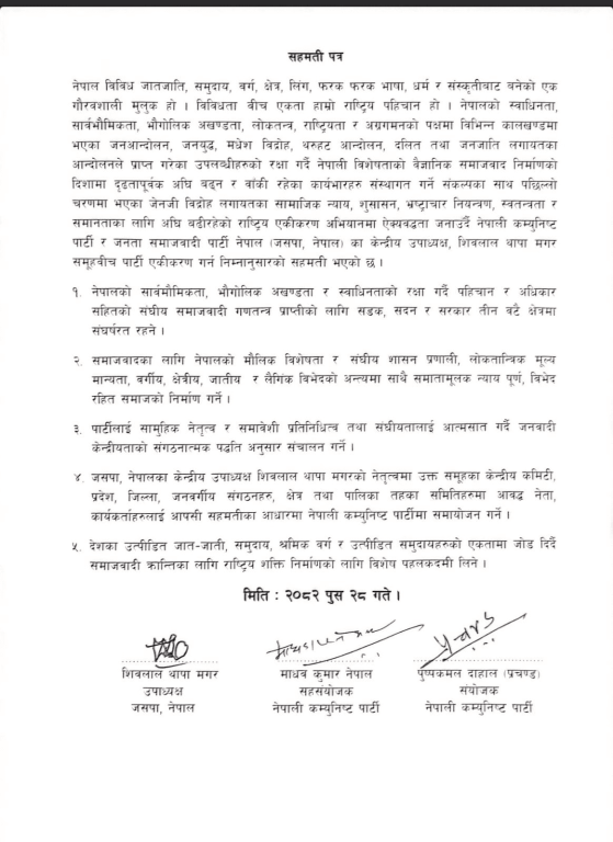 जसपा नेपालका थापा मगर समूहसँग गरिएको ५ बुँदे सहमति यस्ताे छ: