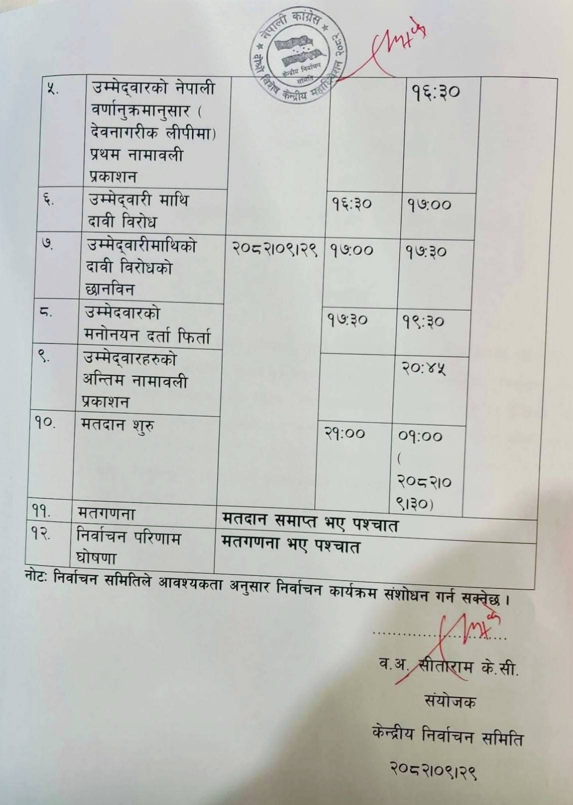 कार्यक्रमअनुसार उम्मेदवारी दर्ता साढे ४ बजे सुरु हुनेछ भने दाबीबिरोधसहितको मतदान ५ बजे सुरु भई राती नौ बजे सकिने समय तोकिएको छ।