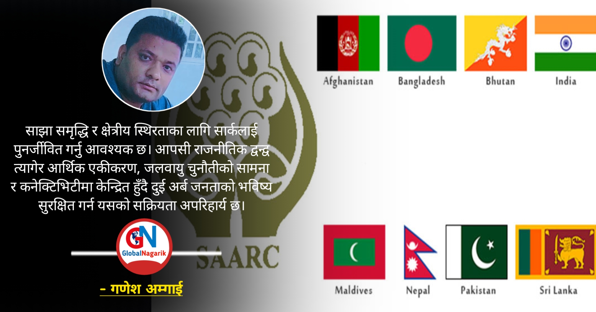 दक्षिण एसियाली क्षेत्रीय सहयोग संगठन (सार्क) को स्थापना सन् १९८५ मा यस क्षेत्रका जनताको साझा समृद्धि र कल्याणका लागि भएको हो। भौगोलिक रूपमा नजिक रहेका नेपाल, भारत, पाकिस्तान, बंगलादेश, भुटान, माल्दिभ्स, श्रीलंका र अफगानिस्तान बीच आर्थिक, सामाजिक र सांस्कृतिक सम्बन्ध प्रगाढ बनाउने यसको मूल उद्देश्य रहेको थियो। स्थापनाको चार दशक बितिसक्दा पनि सार्कले अपेक्षाकृत गति लिन नसकेको यथार्थ हाम्रासामु छ। खासगरी भारत र पाकिस्तान बीचको राजनीतिक द्वन्द्व र अविश्वासले यस संस्थालाई केही समयदेखि निष्क्रिय जस्तै बनाएको देखिन्छ। यति हुँदाहुँदै पनि यस क्षेत्रको साझा पहिचान र सामूहिक स्वार्थका लागि सार्कको सान्दर्भिकता आज पनि उत्तिकै बलियो छ। दक्षिण एसियाली मुलुकहरू ऐतिहासिक र सांस्कृतिक रूपमा जोडिएका हुनाले एकको समस्याले अर्कोलाई प्रत्यक्ष प्रभाव पारिरहेको हुन्छ। त्यसैले, क्षेत्रीय शान्ति र स्थिरताका लागि यो साझा मञ्चको सक्रियता अनिवार्य देखिन्छ। यस क्षेत्रका नागरिकको गरिबी निवारण र आर्थिक विकासका लागि सार्कले सुरु गरेका लक्ष्यहरू अझै पनि उत्तिकै महत्वपूर्ण रहेका छन्।