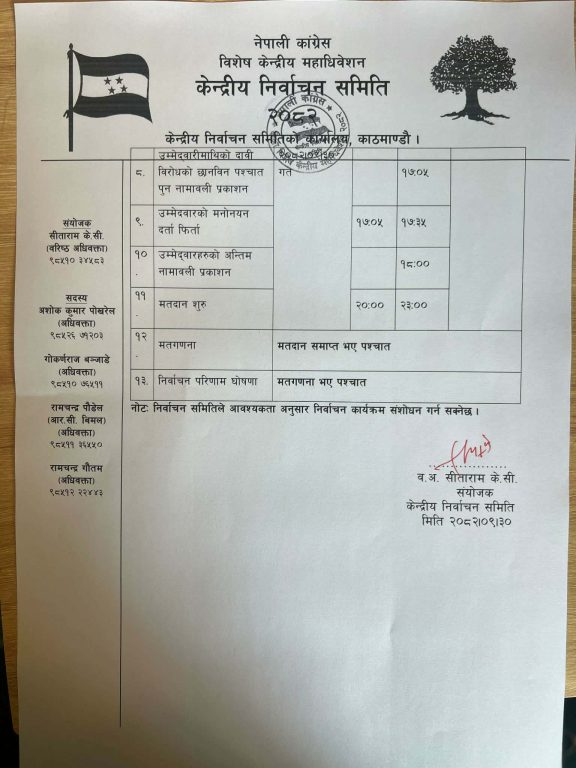 काठमाडौं । काठमाडौंको भृकुटीमण्डपमा जारी नेपाली कांग्रेसको दोस्रो विशेष महाधिवेशनका लागि निर्वाचन कार्यतालिका संशोधन गरिएको छ।