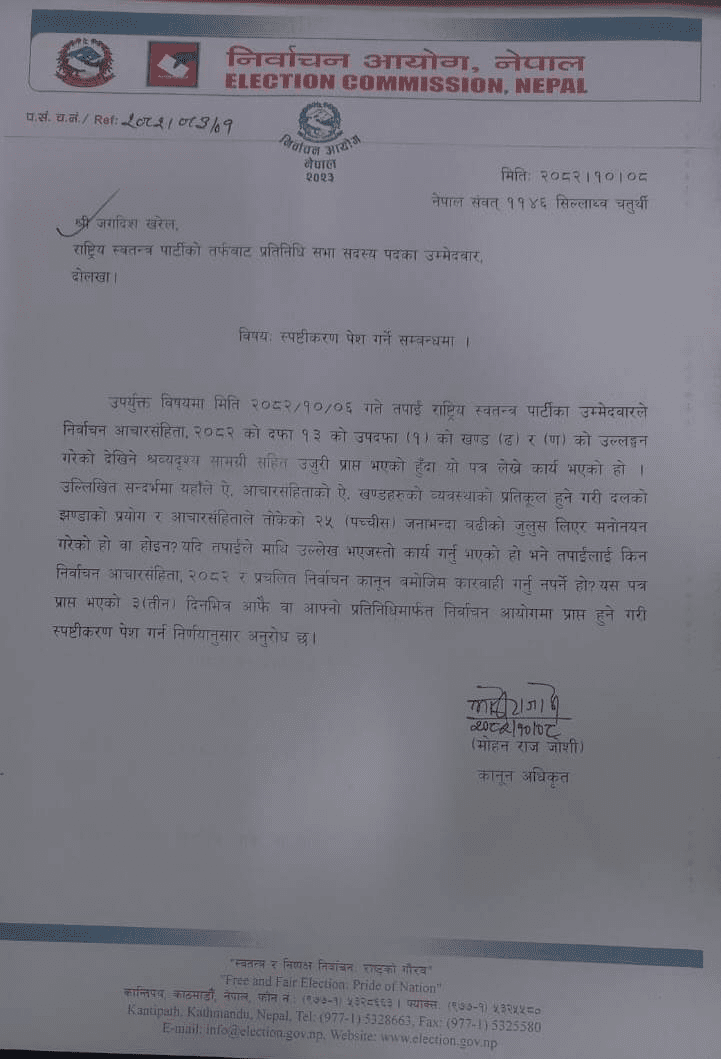 दोलखाबाट उम्मेदवार बनेका खरेलले मनोनयन दर्ताका क्रममा निर्वाचन आचारसंहिता, २०८२ विपरीत दलको झण्डा प्रयोग गरेको तथा तोकिएको संख्याभन्दा बढी व्यक्तिसहित जुलुस निकालेको उजुरी परेपछि आयोगले स्पष्टीकरण माग गरेको हो।