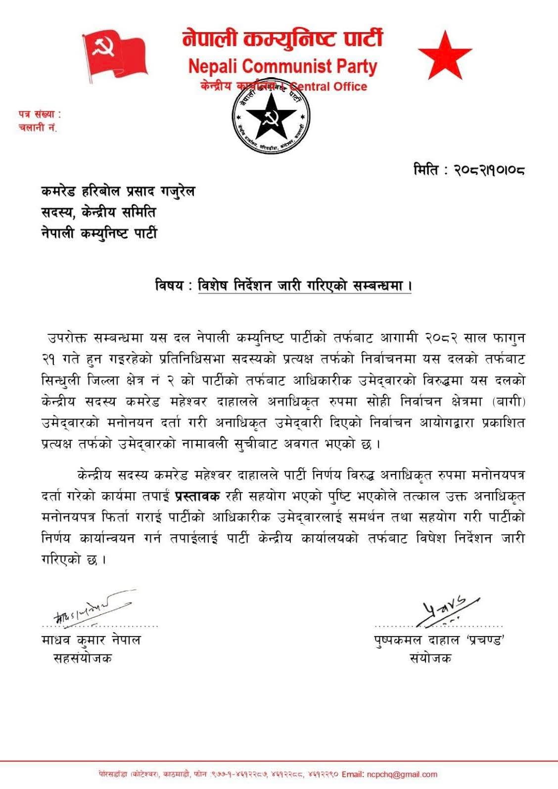 निर्देशन अनुसार, महेश्वर दाहालले पार्टी निर्णयको विपरीत अनधिकृत रूपमा उम्मेदवारी दर्ता गराएको पुष्टि भएपछि, गजुरेललाई प्रस्तावकको हैसियतमा सहयोग नगरी उक्त मनोनयन फिर्ता गराउन भनिएको छ। यस मार्फत पार्टीको आधिकारिक उम्मेदवारलाई पूर्ण समर्थन र सहयोग गर्न समेत निर्देशन जारी गरिएको छ।
