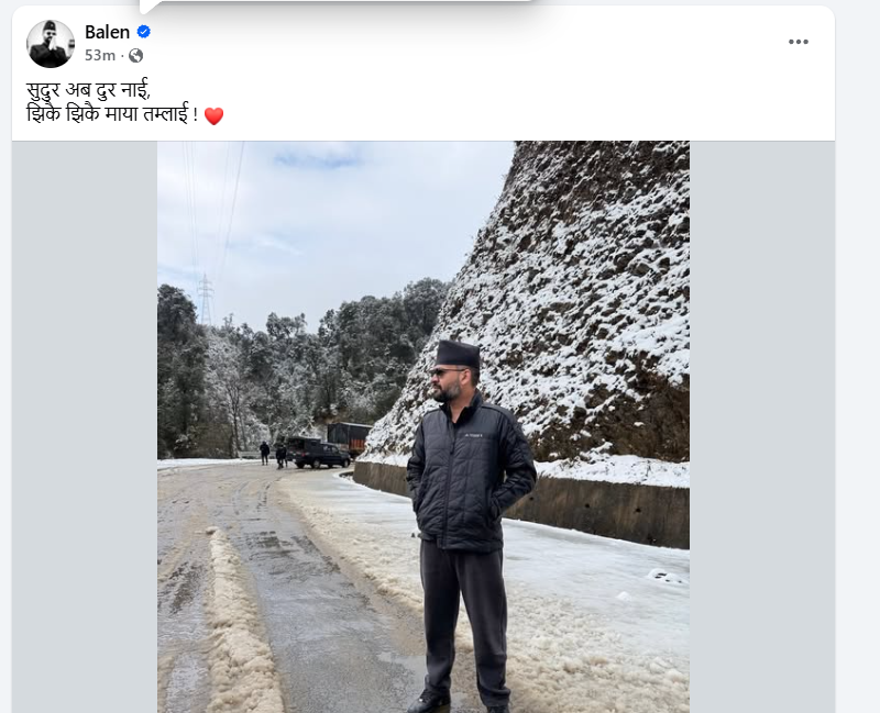 हिमपातले मौसममा मनोरम दृश्य देखेका उनले एक तस्बिर डडेल्धुराबाट पोस्ट गरेका छन् । उनले सामाजिक सञ्जाल फेसबुकमा तस्बिर राख्दै भनेका छन्,‘सुदूर अब दूर नाई, झिकै झिकै मया तम्लाई।’