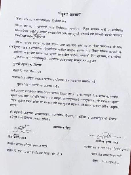 रास्वपाका उम्मेदवार शिव यादव र प्रलोपाका अरविन्द यादवले चुनावी सहकार्यसम्बन्धी सहमतिपत्रमा हस्ताक्षर गरेका छन्। आगामी फागुन २१ गते प्रतिनिधिसभा निर्वाचन हुँदैछ।