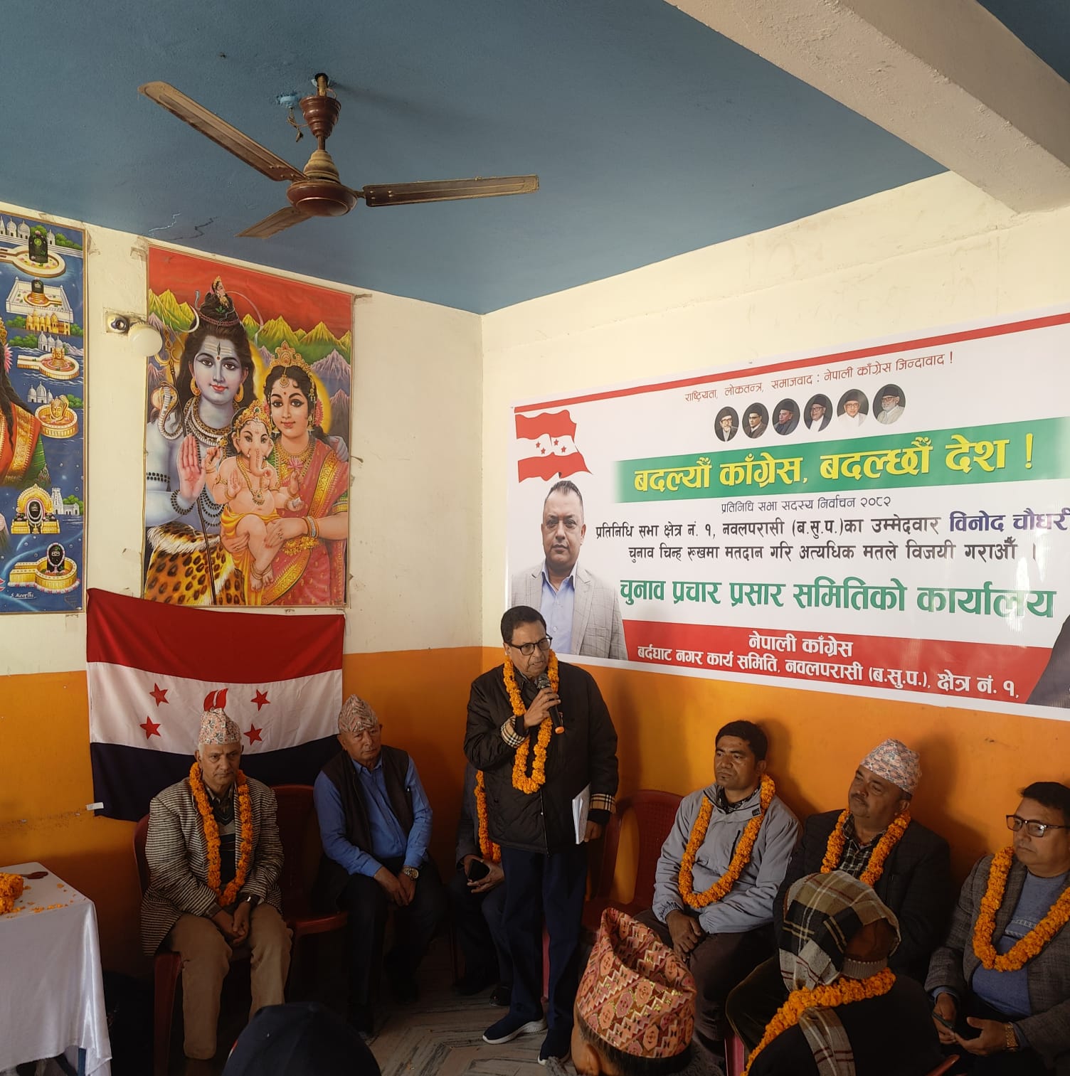 काठमाडाैं । आम निर्वाचनको मिति नजिकिँदै जाँदा नवलपरासी (वसुप) क्षेत्र नं. १ मा नेपाली कांग्रेसले चुनावी अभियानलाई तीव्र बनाएको छ। प्रतिनिधि सभा क्षेत्र नं. १ को चुनाव प्रचार–प्रसार समितिको कार्यालय, बर्दघाटमा आयोजित कार्यक्रममा कांग्रेसका केन्द्रीय सदस्य तथा यस क्षेत्रका उम्मेदवार विनोद चौधरीले गगन थापाको नेतृत्वमा कांग्रेसले देश विकासको स्पष्ट खाका कोर्ने दाबी गरे।
