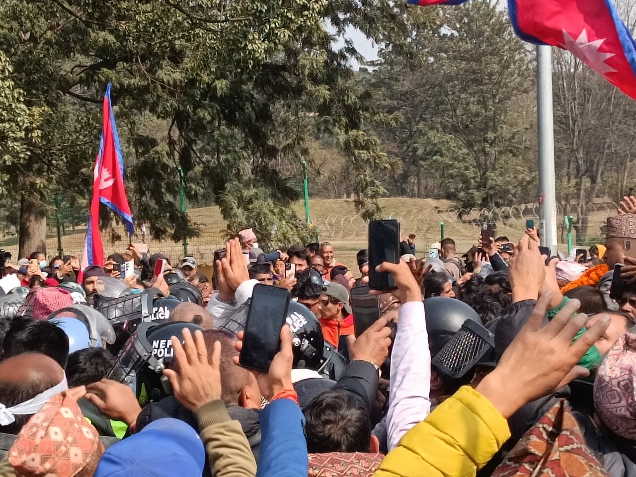 प्रशासनले विमानस्थल क्षेत्रमा निषेधाज्ञा जारी गरेपनि ठूलो संख्यामा राजसंस्था समर्थकहरु स्वागतका लागि पुगेका थिए। उनीहरुले राजसंस्था समर्थित नारा लगाएका थिए। पूर्वराजा शाह शुक्रबार हेलिकप्टरमार्फत झापाबाट काठमाडौं आएका थिए।