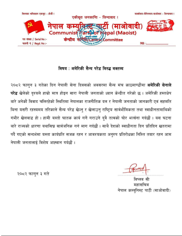 पार्टीका महासचिव नेत्र विक्रम चन्द विप्लवले सोमबार जारी गरेको विज्ञप्तिमा नेपाली जनता र प्रमुख राजनीतिक दलहरूको सहमति बेगर अमेरिकी सेनालाई परेडमा सहभागी गराइनु रहस्यमय र आपत्तिजनक कदम भएको उल्लेख गरिएको छ। विज्ञप्तिमा यसले राष्ट्रिय सार्वभौमिकता र स्वाधीनतामाथि गम्भीर प्रश्न उठाएको दाबी गरिएको छ।