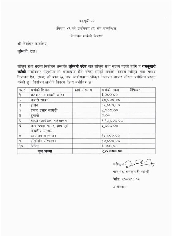 खर्च विवरणअनुसार मतदाता नामावली खरिदमा ३ हजार रुपैयाँ, सवारी साधन व्यवस्थापनमा ६० हजार र इन्धनमा १५ हजार रुपैयाँ खर्च गरिएको छ। त्यस्तै, प्रचार–प्रसार सामग्रीमा ५ हजार, गोष्ठी तथा कार्यकर्ता परिचालनमा १ लाख २० हजार तथा छापा र विद्युतीय माध्यमसहित अन्य प्रचार–प्रसारमा ५ हजार रुपैयाँ खर्च भएको जनाइएको छ।