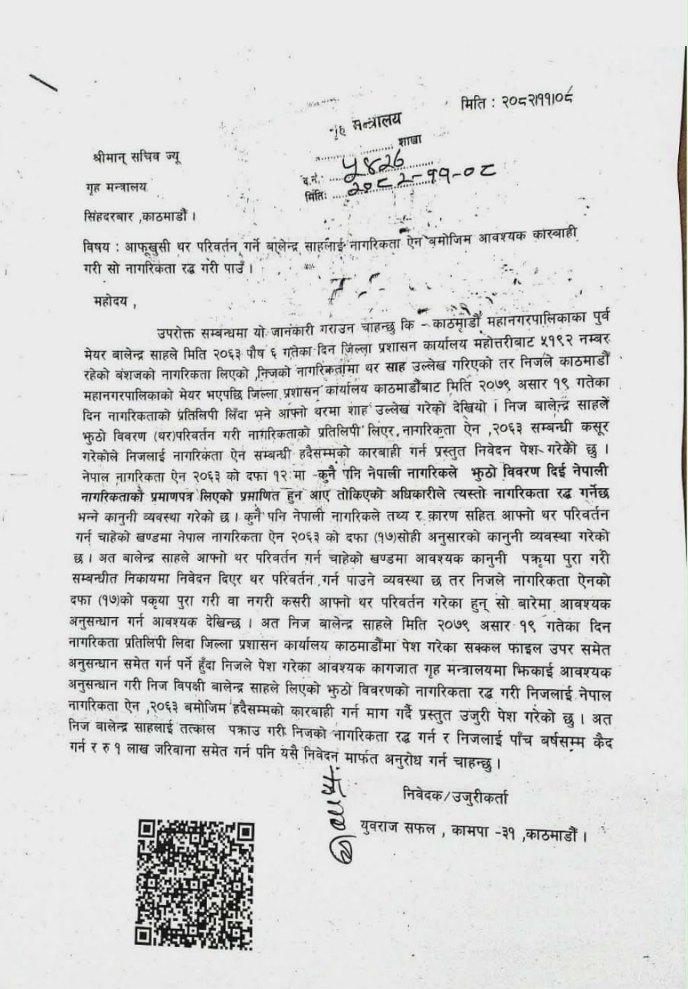 निवेदनमा सम्बन्धित कागजातको अनुसन्धान गरी कानुन बमोजिम नागरिकता खारेज गर्न तथा पाँच वर्षसम्म कैद र एक लाख रुपैयाँसम्म जरिवाना गर्न माग गरिएको छ।