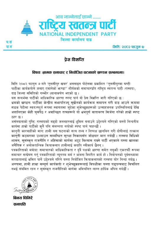 ‘रास्वपाको बढ्दो जनसमर्थनलाई बदनाम गर्ने उद्देश्यले गरिएको यस्तो निन्दनीय कार्यमा हाम्रो पार्टीको कुनै पनि संलग्नता छैन,’ विज्ञप्तिमा उल्लेख छ । पार्टीले घटनाको सत्यतथ्य सार्वजनिक गर्न र दोषीलाई कारबाही गर्न सम्बन्धित निकायसँग माग गरेको छ ।