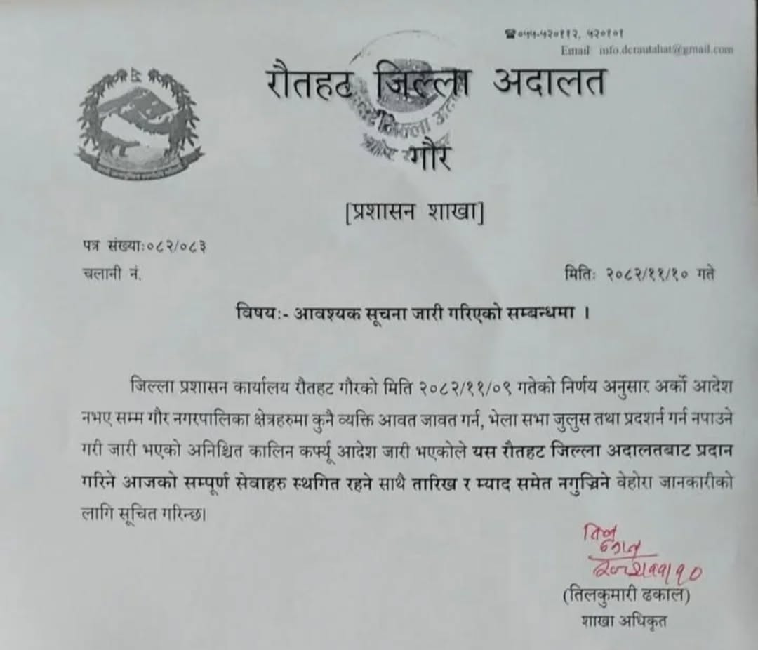 जिल्ला प्रशासन कार्यालय रौतहट गौरले अर्को आदेश नभएसम्म गौर नगरपालिका क्षेत्रमा कुनै व्यक्ति आवतजावत गर्न, भेला सभा जुलुस तथा प्रदशर्न गर्न नपाउने गरी जारी भएको अनिश्चितकालीन कर्फ्यू आदेश जारी भएकाले अदालतको कामकारबाही पनि प्रभावित भएको जनाएको छ ।