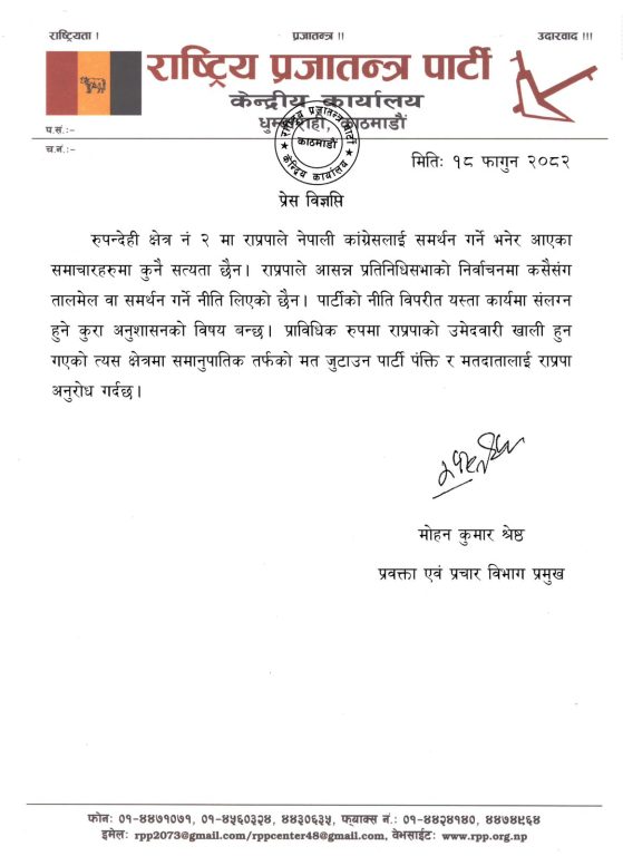 काठमाडौं । राष्ट्रिय प्रजातन्त्र पार्टी (राप्रपा) ले रूपन्देही क्षेत्र नम्बर २ मा कांग्रेसलाई समर्थन गर्ने निर्णय गरेको समाचार पूर्णतया गलत भएको स्पष्ट पारेको छ।