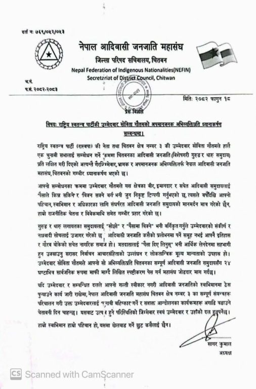 उक्त अभिव्यक्तिप्रति आपत्ति जनाउँदै नेपाल आदिवासी जनजाति महासंघ जिल्ला परिषद् सचिवालय चितवनले विज्ञप्ति जारी गरेको छ। महासंघले गौतमको अभिव्यक्तिले इमानदार, सचेत र स्वाभिमानी आदिवासी समुदायलाई ‘पैसाले किन्न सकिने’ तथा ‘बिक्न सक्ने वर्ग’का रूपमा चित्रण गरेको भन्दै त्यसले समुदायको मानमर्दन गरेको जनाएको छ।