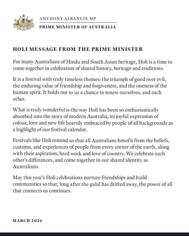 सिड्नी । अस्ट्रेलियाका प्रधानमन्त्री एन्थोनी अल्बानिजले रङहरूको पर्व होलीको अवसरमा अस्ट्रेलियामा बसोबास गर्ने हिन्दु तथा दक्षिण एसियाली समुदायलाई शुभकामना दिएका छन्।