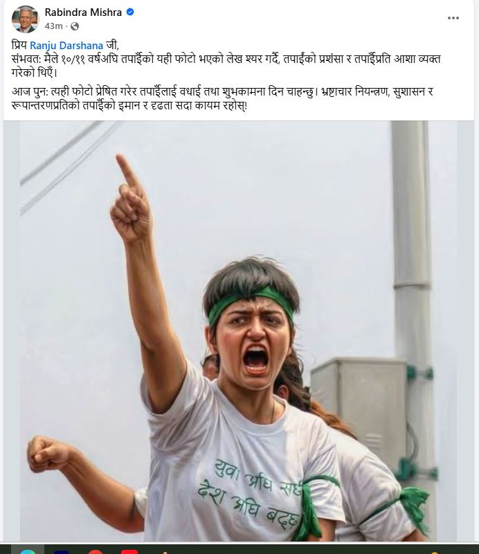 मिश्रले सामाजिक सञ्जालमार्फत ११ वर्षअघिको एउटा फोटो फेरि सेयर गर्दै रञ्जुको प्रशंसा गरेका हुन् । उक्त फोटोसँगै उनले लेखेका छन्, “प्रिय रञ्जु दर्शनाजी, सम्भवतः मैले १०–११ वर्षअघि तपाईंको यही फोटो शेयर गर्दै तपाईंको प्रशंसा र तपाईंप्रति आशा व्यक्त गरेको थिएँ । आज पुनः त्यही फोटो प्रेषित गरेर तपाईंलाई बधाई तथा शुभकामना दिन चाहन्छु । भ्रष्टाचार नियन्त्रण, सुशासन र रूपान्तरणप्रतिको तपाईंको इमान र दृढता सदा कायम रहोस् !”