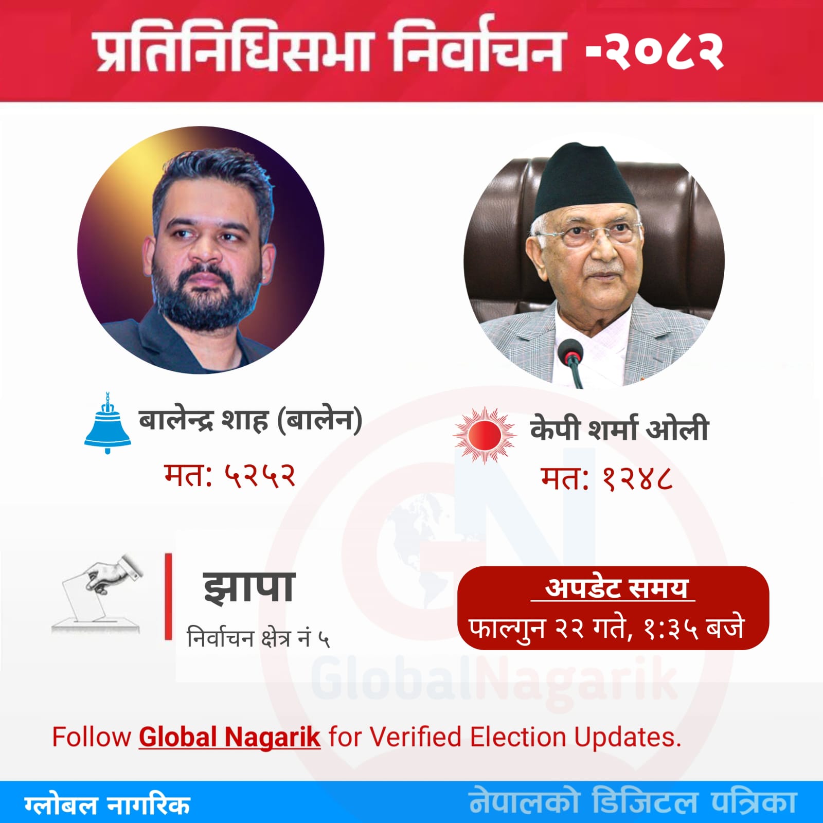 दिउँसो १ बजेर १५ मिनेटसम्मको आधिकारिक मतगणना अनुसार बालेनले ५ हजार २५४ मत प्राप्त गरेका छन्। उनका प्रमुख प्रतिस्पर्धी नेकपा (एमाले) का उम्मेदवार तथा पूर्वप्रधानमन्त्री केपी शर्मा ओलीले १ हजार २४८ मत ल्याएका छन्।