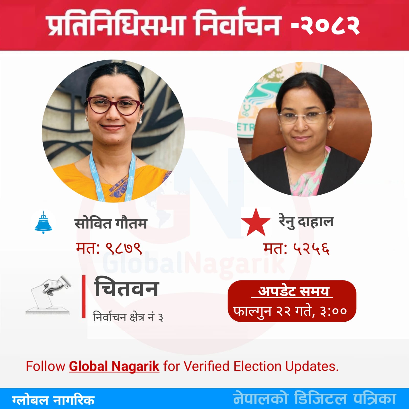 चितवन । प्रतिनिधिसभा निर्वाचनअन्तर्गत चितवन क्षेत्र नम्बर–३ मा राष्ट्रिय स्वतन्त्र पार्टी (रास्वपा)की उम्मेदवार सोविता गौतमले उल्लेखनीय अग्रता कायम गरेकी छिन्।