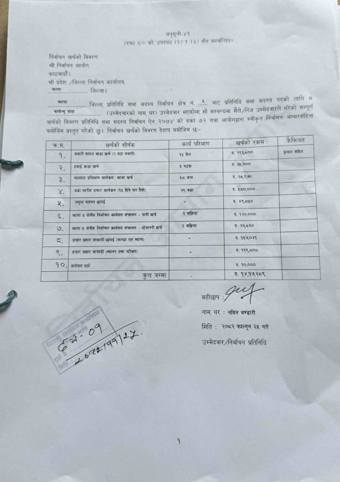 यसैगरी, उम्मेदवारी मनोनयनका लागि उनले १० हजार रुपैयाँ खर्च गरेको विवरणमा उल्लेख गरिएको छ।