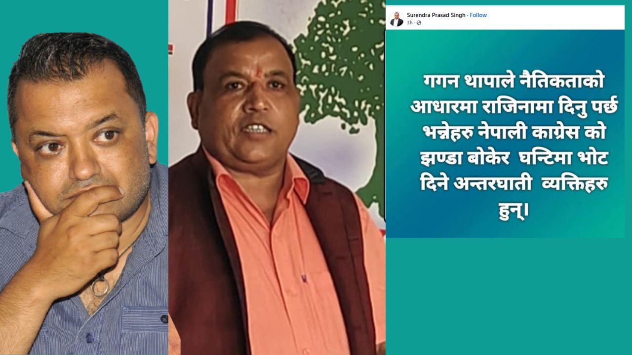 काठमाडौं। नेपाली कांग्रेस मधेस प्रदेशका उपसभापति बिरेन्द्र प्रसाद सिंहका दाई एवम् नेपाली कांग्रेस सर्लाहीका पूर्वसभापति सुरेन्द्र बहादुर सिंहले कांग्रेसका सभापति गगन थापाले नैतिकताको आधारमा राजीनामा दिनुपर्छ भन्नेहरु काग्रेसको झण्डा बोकेर घन्टीमा भोट दिने अन्तरघाती व्यक्तिहरु भएको बताएका छन् ।