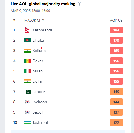 काठमाडौँपछि बङ्गलादेशको ढाका १७० एक्यूआईका साथ दोस्रो र भारतको कोलकाता १६९ एक्यूआईका साथ तेस्रो स्थानमा रहेका छन् । बढ्दो सवारी साधनको चाप, सडक विस्तारका क्रममा उड्ने धुलो र पछिल्लो समय देशका विभिन्न भागमा लागिरहेको वन डढेलोका कारण काठमाडौँको हावा विषाक्त बन्दै गएको विज्ञहरूको भनाइ छ ।