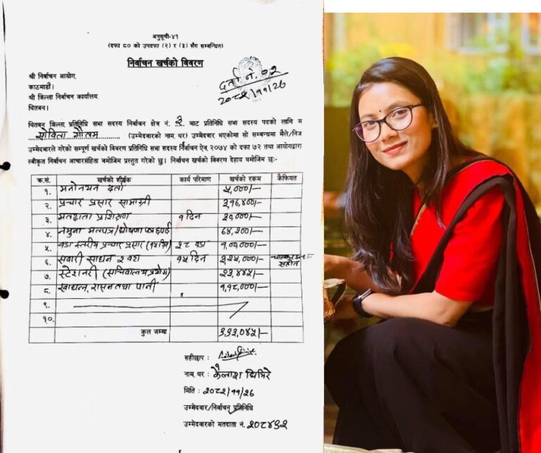 काठमाडौं  । सोविता गौतम ले चितवन–३ बाट प्रतिनिधिसभा सदस्य निर्वाचनमा भएको आफ्नो खर्च विवरण सार्वजनिक गरेकी छन्। राष्ट्रिय स्वतन्त्र पार्टी (रास्वपा) की उम्मेदवार गौतमले निर्वाचन आयोग नेपाल मा पेस गरेको विवरणअनुसार उनले जम्मा ९ लाख ९३ हजार ४५ रुपैयाँ खर्च गरेको उल्लेख छ।