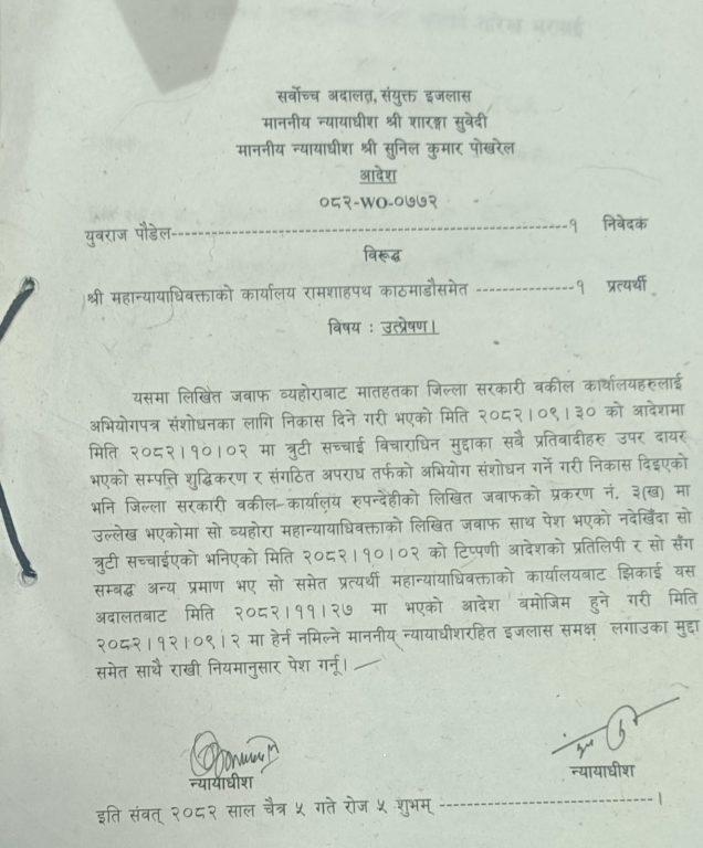 काठमाडौं । सर्वोच्च अदालतले रवि लामिछाने सम्बन्धी मुद्दामा अभियोगपत्र संशोधनका विषयमा दिइएको निर्देशन र त्यससँग सम्बन्धित कागजातहरू महान्यायाधिवक्ताको कार्यालयबाट झिकाउन आदेश दिएको छ।