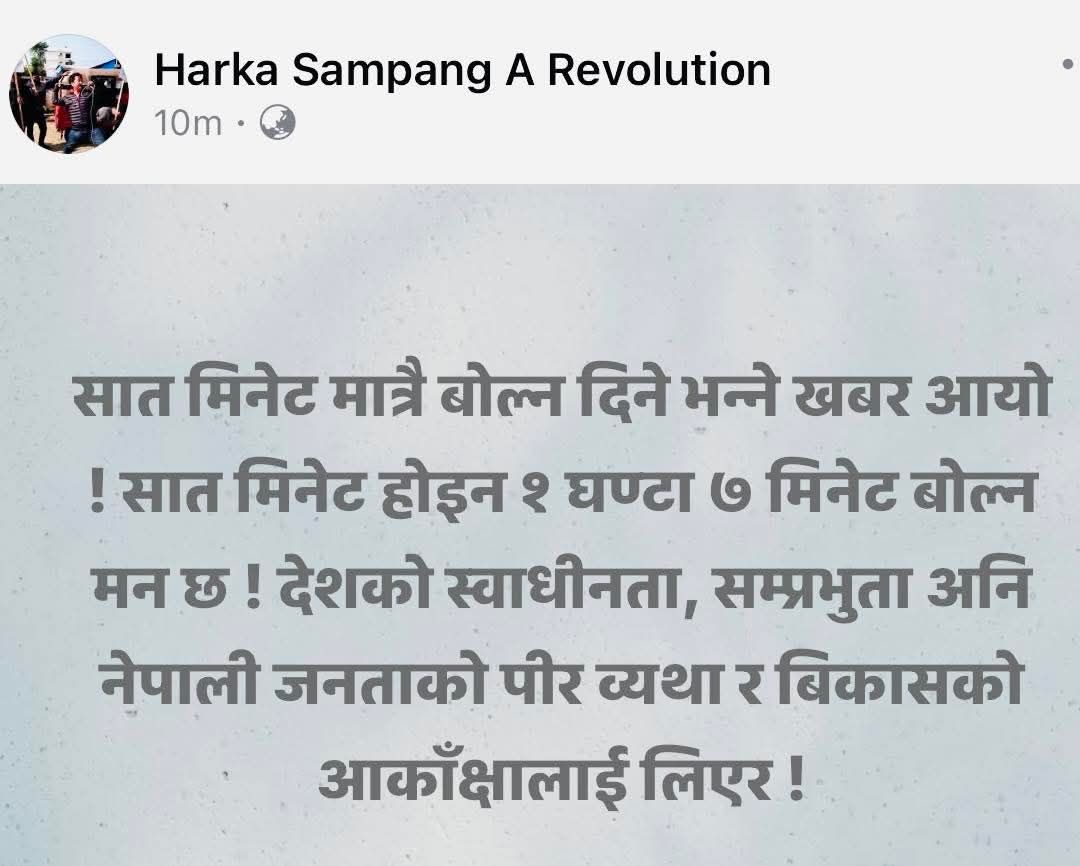 दलगतरुपमा शुभकामना मन्तव्यका लागि उनले ७ मिनेटको मात्रै समय पाएका छन् । तर, हर्क साम्पाङ लाई देशको स्वाधीनता, सम्प्रभुता अनि नेपाली जनताको पीर व्यथा र विकासको आकांक्षाबारे १ घण्टा ७ मिनेट बोल्ने रहर छ ।