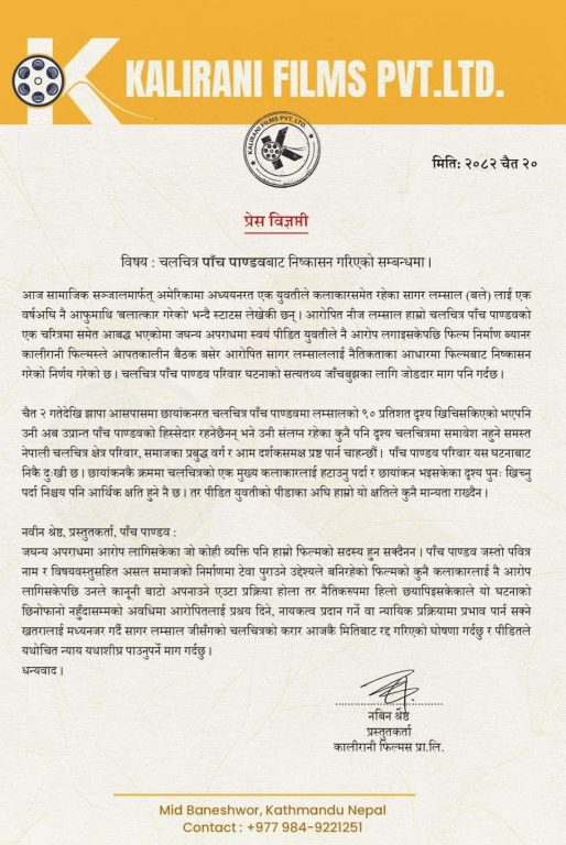 चलचित्रका प्रस्तुतकर्ता नवीन श्रेष्ठका अनुसार करिब सबै काम सकिएका कलाकारलाई हटाउँदा फिल्मलाई आर्थिक क्षति पुग्ने भए पनि पीडित युवतीको न्याय र सुरक्षित वातावरण सुनिश्चित गर्नु अझ महत्वपूर्ण रहेको कम्पनीको ठहर छ। विज्ञप्तिमा भनिएको छ, ‘जघन्य अपराधमा आरोप लागिसकेका जो कोही पनि हाम्रो फिल्मको सदस्य हुन सक्दैनन्। ‘पाँच पाण्डव’ जस्तो पवित्र नाम र सामाजिक सन्देश भएको फिल्ममा आरोपितलाई राख्दा न्याय प्रक्रियामा प्रभाव पर्न सक्ने भएकाले सम्झौता तत्काल रद्द गरिएको छ।’