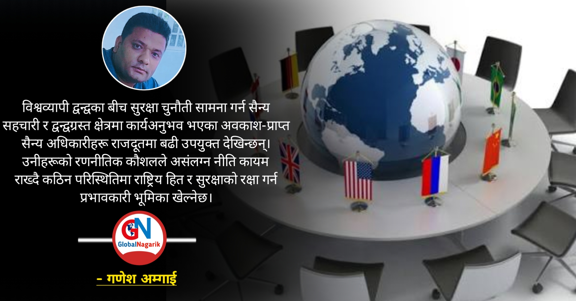 यस्तो जटिल भू-राजनीतिक र सुरक्षा चुनौतीको घडीमा नेपालको कूटनीतिक मोर्चालाई सशक्त बनाउनु अपरिहार्य छ। वर्तमान सरकारले अघिल्लो सरकारद्वारा नियुक्त राजदूतहरू फिर्ता बोलाउने र नयाँ नियुक्ति गर्ने चर्चा चलिरहँदा, अब नियुक्त हुने राजदूतहरू केवल राजनीतिक भागबन्डाका आधारमा नभई अन्तर्राष्ट्रिय सम्बन्ध, कूटनीति, भू-राजनीति, अर्थतन्त्र र सुरक्षा मामिलामा गहिरो दख्खल राख्ने विज्ञहरू हुनुपर्छ। विशेषगरी, द्वन्द्वग्रस्त क्षेत्र र सामरिक महत्त्वका देशहरूमा नेपाली सेनाबाट अवकाश प्राप्त रथीवृन्द तथा उच्च अधिकारीहरू, जोसँग संयुक्त राष्ट्रसंघका विभिन्न मिसनहरूमा द्वन्द्व व्यवस्थापनको कूटनीतिक अनुभव छ र जसले सैनिक सहचारी’ का रूपमा सैन्य कूटनीतिमा कुशलतापूर्वक काम गरिसकेका छन्, उनीहरू यो जिम्मेवारीका लागि उपयुक्त पात्र हुन सक्छन्। यस्ता अनुभवी व्यक्तित्वहरूको परिचालनले वर्तमान विश्व द्वन्द्वको समयमा नेपालको राष्ट्रिय सुरक्षा र कूटनीतिक हितलाई थप मजबुत बनाउन निर्णायक भूमिका खेल्ने निश्चित छ।
