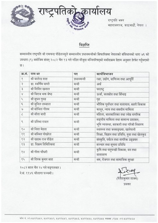 काठमाडौं। राष्ट्रपति रामचन्द्र पौडेलले मन्त्रिपरिषद्का सदस्यहरूको मर्यादाक्रम हेरफेर गरेका छन् ।