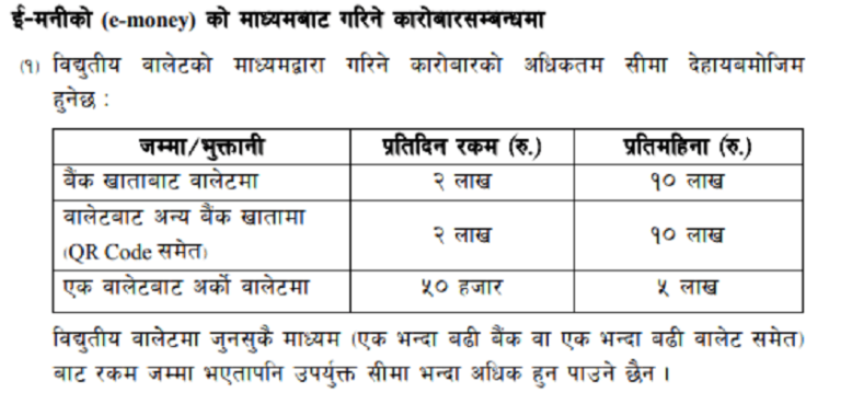 त्यस्तै, वालेटमा रातभर ५० हजार रुपैयाँभन्दा बढी मौज्दात राख्न नपाइने व्यवस्था गरिएको छ। सोभन्दा बढी रकम स्वतः सम्बन्धित प्रयोगकर्ताको बैंक खातामा स्थानान्तरण हुने प्रावधान पनि निर्देशनमा समावेश गरिएको छ।