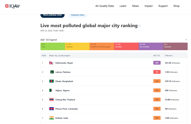 काठमाडौं। विश्व वायु गुणस्तर निगरानी संस्था द्वारा सार्वजनिक पछिल्लो प्रतिवेदनअनुसार नेपालको राजधानी काठमाडौं विश्वकै सबैभन्दा बढी प्रदूषित प्रमुख सहरको सूचीमा पहिलो स्थानमा पुगेको छ।