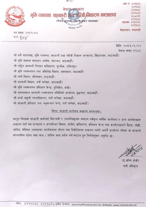 मन्त्रालयअन्तर्गतको योजना, अनुगमन तथा मूल्याङ्कन महाशाखाले जारी गरेको परिपत्रमा सरकारी खर्चलाई मितव्ययी, पारदर्शी र प्रभावकारी बनाउन यस्तो निर्णय गरिएको उल्लेख गरिएको छ ।