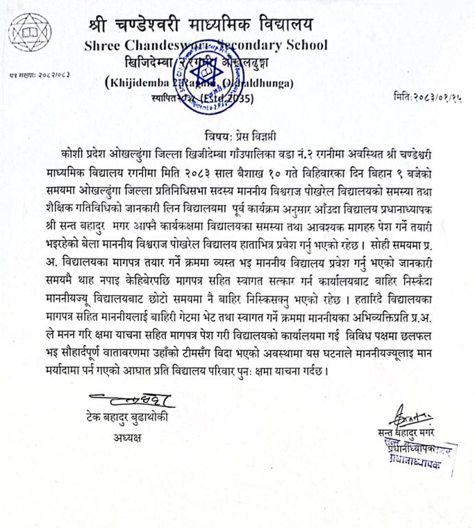 खिजीदेम्बा गाउँपालिका–२ रगनीमा रहेको श्री चण्डेश्वरी माध्यमिक विद्यालयका प्रधानाध्यापक मगर र विद्यालय व्यवस्थापन समिति (विव्यस) का अध्यक्ष टेकबहादुर बुढाथोकीले मंगलबार संयुक्त विज्ञप्ति जारी गर्दै सांसद पोखरेलप्रति क्षमा मागेका हुन्।