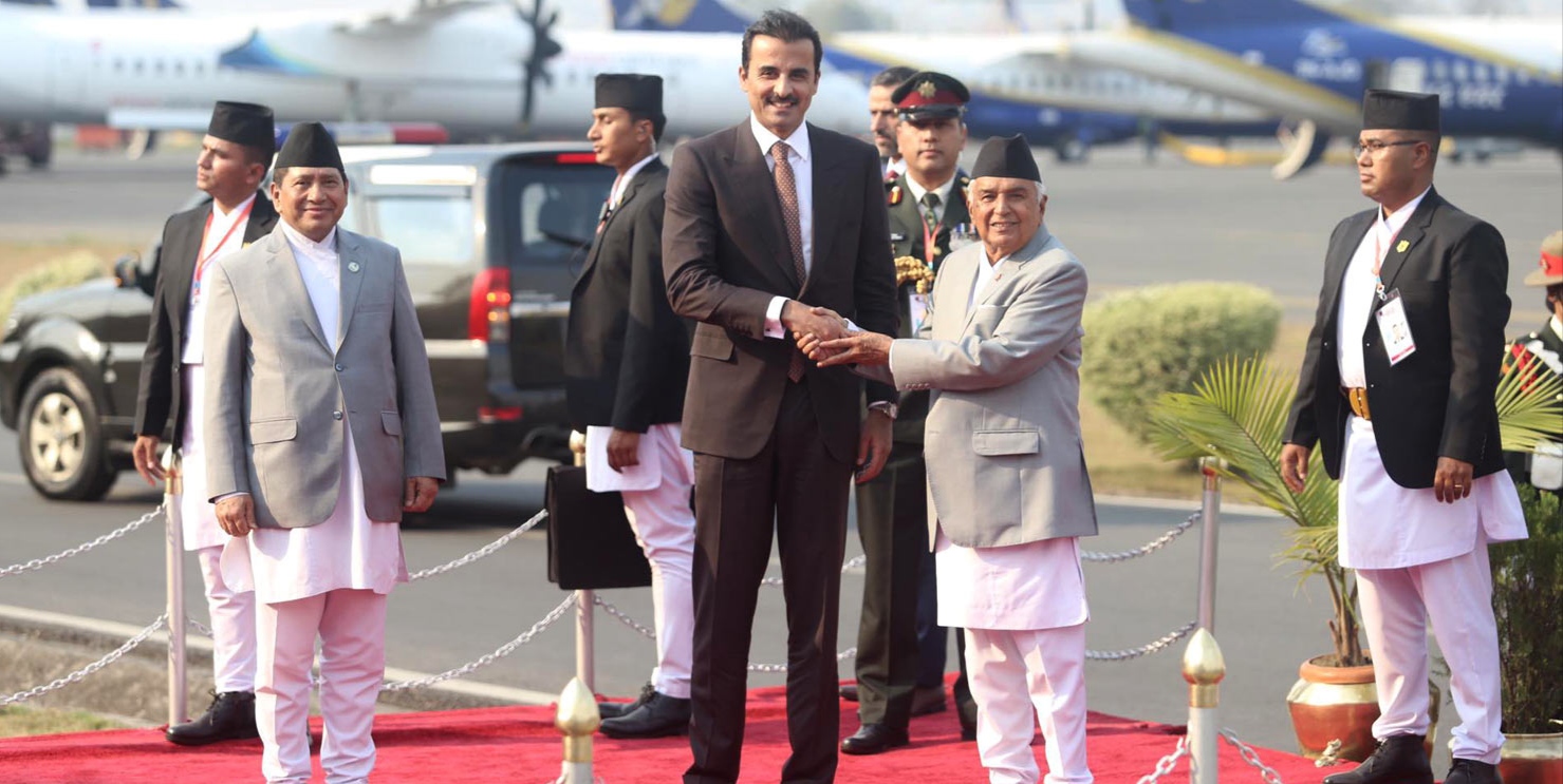 काठमाडौं । कतारका राजा (अमिर) शेख तमिम बिन हमाद अल थानी काठमाडौं आइपुगेका छन्। दुई दिने भ्रमणका क्रममा उनी मंगलबार दिउँसो साढे ३ बजे आसपास उनको विमान त्रिभुवन विमानस्थल अवतरण गरेको हो। उनी नेपालका राष्ट्रपति रामचन्द्र पौडेलको निमन्त्रणमा नेपाल भ्रमणमा आएका हुन्।